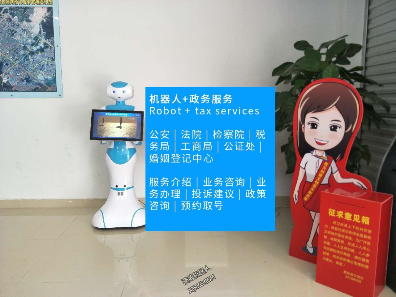 澳博機器人提出了”機器人+政務服務“的解決方案,使用佩佩機器人結合政務開發落地于惠州一處政務大廳