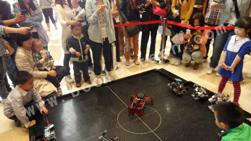 機器人足球比賽是一個互動性很強的環節,同學們可以遙控機器人行走、踢球、撲球、甚至跌到了,還會迅速爬起來繼續作戰!現場不斷傳出一陣陣的歡呼聲。